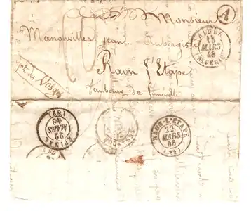 1848: письмо домарочного периода, отправленное в Раон-л'Этап и имеющее круглые календарные штемпели[^]