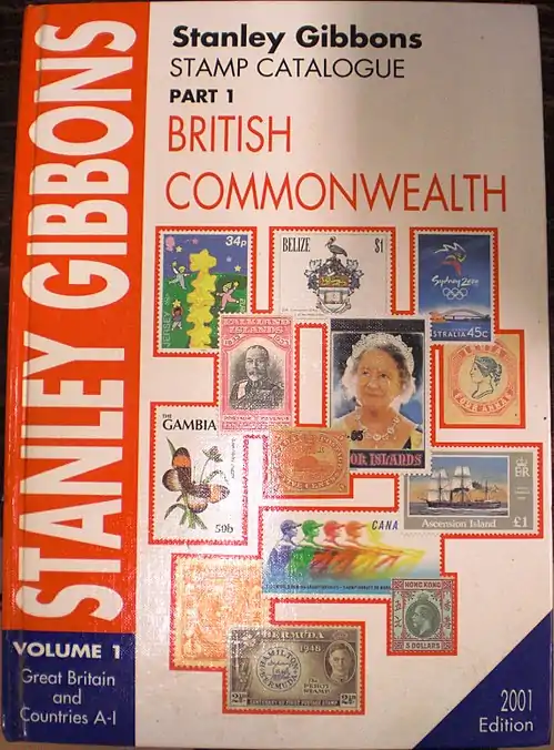 Каталог «Стэнли Гиббонс» (красный, 2001) для Великобритании и Содружества, на обложке которого посредине вверху можно увидеть марку Белиза 1998 года, номиналом в 1 белизский доллар, посвящённую 50-летию Университета Вест-Индии (Mi #1194)[^]