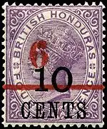 ![]() Одна из ранних марок Британского Гондураса 1882 года[^] номиналом в 4 пенса, на которой к 1891 году дважды делались надпечатки[^] | |