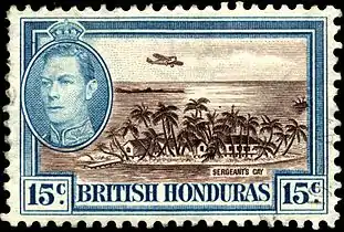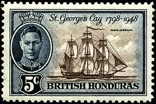 Как и многие британские колонии, Британский Гондурас выпустил свои первые видовые марки в 1938 году в виде серии из 12 почтовых марок номиналом от 1 цента до 5 долларов[≡]. Рисунки двухцветных марок представляли фигуры майя, сельское хозяйство и местные ландшафты. 150-летие сражения при Сент-Джордж Кей было отмечено в 1949 году выпуском шести почтовых марок: на трёх марках был изображён остров, и на трёх — британский шлюп «Мерлин» (Merlin)[≡].