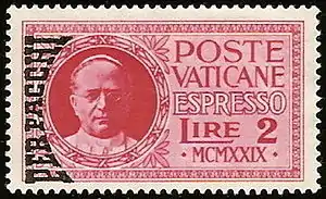 В октябре 1931 года вся серия первых стандартных марок была надпечатана словами «PER PACCHI» («Для посылок») для использования на почтовых бандеролях. Это были первые и единственные посылочные марки Ватикана[1][2].