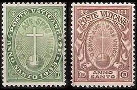 1 апреля 1933 года Ватикан выпустил свои первые коммеморативные марки, одновременно ставшими и первыми почтово-благотворительными — серию из четырёх марок, посвящённых 24-му Юбилейному году. На миниатюрах изображён крест на шаре[1][2].