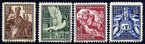 В июне 1938 года вышла первая серия из восьми авиапочтовых марок Ватикана. На миниатюрах были изображены: статуя Святого Петра, голубь мира над Ватиканом, вознесение пророка Илии и Дева Мария и ангелы, переносящие Святой Дом в итальянский город Лорето[1][2].