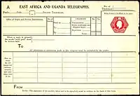 Почтовая администрация Восточной Африки и Уганды выпускала маркированные конверты, заказные конверты, бандероли, почтовые карточки и бланк телеграммы. Рисунок почтовых марок, напечатанных на заказных конвертах, бандеролях и почтовых карточках был аналогичен рисунку, который использовался на почтовых марках.[3][4]
