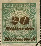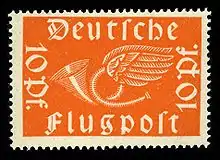 Имперская почта продолжала работать как государственная организация после провозглашения Германии республикой. В 1919 году «Рейхспочта» выпустила свои первые коммеморативные, авиапочтовые и почтово-благотворительные марки[14]. На первой почтово-благотворительной марке в 1919 году была сделана надпечатка нового тарифа в пользу инвалидов войны ( (Sc #B1)). В 1923 году в период гиперинфляции «Рейхспочта» выпустила почтовые марки номиналами до 50 миллиардов марок. Самыми распространёнными марочными сериями тогда были серия «знаменитые немцы», а затем марки с Гинденбургом. Первая марка из ценимой немецкой серии «Цеппелины» появилась в 1928 году ( (Sc #C35-37)).