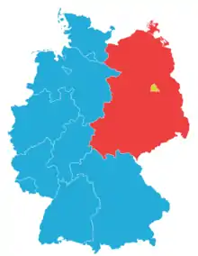 ![]() Карта Германии в 1957—1990 годах, до объединения ФРГ, ГДР и Западного Берлина |