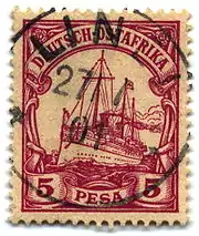 В 1900 году Германия подготовила для почтового обращения колониальную серию «Яхта „Гогенцоллерн“» с рисунком, общим для всех германских колоний, на котором было изображено одноимённое судно. Эти марки стали применяться в Германской Восточной Африке с 1901 года[1]. При этом указывались номиналы в пезах и рупиях[6] и ставилась оригинальная надпись «DEUTSCH-OSTAFRIKA» («Германская Восточная Африка»)[5].