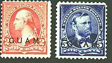 ![]() Почтовые марки Гуама (1899): для надпечатывания использованы марки США 1894 и 1899 годов (Sc #??) | |
