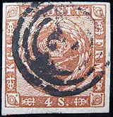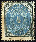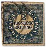 ![]() Первая почтовая марка Дании, погашенная номерным штемпелем Копенгагена, 1851 (Mi #1) | |