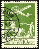 В июне 1925 года были выпущены первые авиапочтовые марки Дании. На них был изображён самолёт, пролетающий над пахарем. Авиапочтовые марки могли быть использованы только для оплаты авиапочтовых отправлений, хотя последние могли оплачиваться и обычными марками. После отмены дополнительной оплаты авиапочтовой корреспонденции на некоторых линиях выпуск авиапочтовых марок в конце апреля 1940 года был прекращён. Всего выпущено 10 авиапочтовых марок[5][6][7].