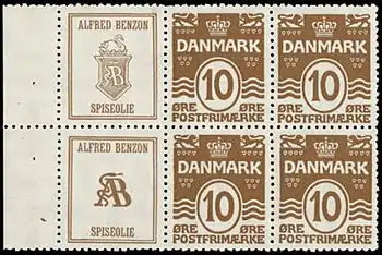 С сентября 1927 по июль 1933 года датская почта выпускала марки с рекламными купонами, сброшюрованные в марочные тетрадки (буклеты). Каждый листок состоял из четырёх марок и вертикальной пары купонов с рекламными рисунками (слева). Марки выпускались в листах, состоящих из 60 марок и 30 купонов с рекламой, которые находились в первом, шестом и восьмом вертикальных рядах. Седьмой ряд разрезался пополам и служил для вклеивания. Из листа изготовлялось 15 листков. Существует свыше 60 различных реклам[5].