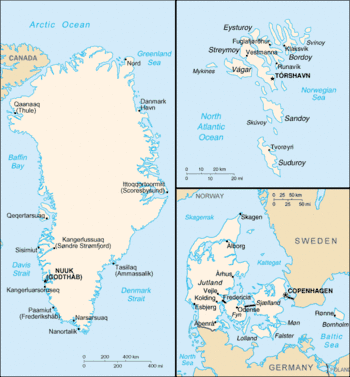 ![]() Карта Датского Соединённого королевства, включая Данию, Фарерские острова и Гренландию |