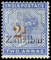 ![]() Марка Занзибара (1896): надпечатка «Zanzibar» («Занзибар») и номинала «2½» на марке Британской Индии номиналом в 2 анны. Разновидность с перевёрнутой «единицей» в надпечатке «2½» из ряда 5/6 печатной пластины | |