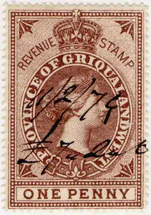 Первые почтовые марки специально для Западного Грикваленда были эмитированы в марте 1877 года и представляли собой почтовые марки Мыса Доброй Надежды с надпечаткой англ. «G. W.» или «G.» (сокр. от «Западный Грикваленд» или «Грикваленд»).[3]