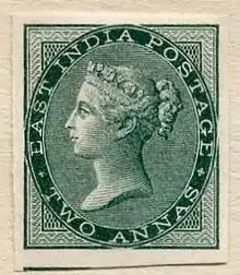 В 1855 году появилась марка нового дизайна с королевой Викторией в овальной виньетке внутри прямоугольной рамки. Эти марки разработала и напечатала с использованием глубокой печати английская компания De La Rue. Эта же компания осуществляла выпуск всех почтовых марок Британской Индии вплоть до 1925 года[16]. Новые марки оставались в обращении и после того, как британское правительство взяло на себя управление Индией в 1858 году после Восстания сипаев. С 1865 индийские почтовые марки печатались на бумаге с водяным знаком в виде головы слона.