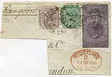 Новые тарифы привели к нехватке марок. Из-за этого почтовой службе пришлось прибегать к нестандартным ходам. Одним из способов стало использование в качестве почтовых фискальных марок с надпечаткой «Service Postage». В 1866 году были выпущены новые марки номиналом в 4 анны и 6 анн 8 паев. Однако эти действия не смогли покрыть дефицит, поэтому появились временные знаки оплаты (провизории)[20] номиналом в 6 анн, изготовленные из фискальной марки с отрезанными верхней и нижней частями и надпечаткой «Postage» («Почтовый сбор»).