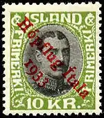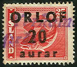 Последняя надпечатка сделана 31 марта 1954 года по изменению номинала в 5 исландских эйре (Aurar) на марке Исландии в связи с необходимостью марок данного номинала. Имела хождение до 31 декабря 1958 года[4].