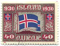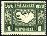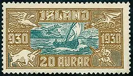 В январе 1930 марки поступила в обращение, однако вскоре выяснилось, что они отпечатаны в гораздо большем количестве, чем было заказано, предположительно на общую сумму 1 813 000 крон, и «Общество» продает их торговцам марками. Выявилось также множество разновидностей, продававшихся по очень высоким ценам. Полицейское расследование, начатое по факту мошенничества, было прервано с началом Второй мировой войной и после не возобновлялось. Марки были изъяты из обращения 31 июля 1930 года.[2] Вторая серия в честь 1000-летия исландского парламента, заказанная в Великобритании, поступила в обращение 1 июня 1930 года. Она предназначалась для авиапочты. Её тираж составил 25,5 тысяч экземпляров. Изъята 31 декабря 1930 года. Это были первые коммеморативные выпуски марок Исландии.[2]