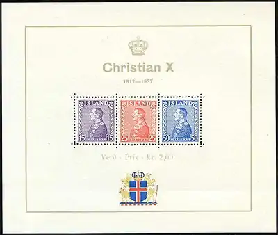 Первый почтовый блок был выпущен в мае 1937 года. Он был посвящён 25-летию правления короля Кристиана X.[2][3]