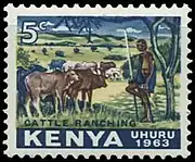 ![]() Одна из первых почтовых марок Кении номиналом в 5 центов (1963) | |
