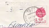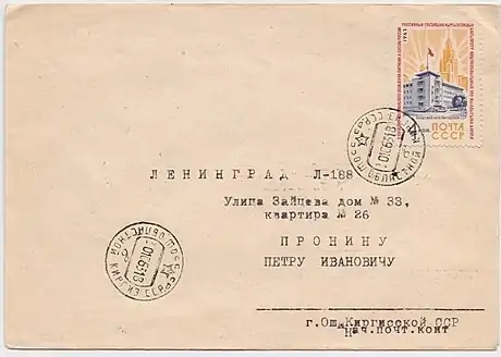 | Письмо из Оша в Ленинград, франкированное почтовой маркой СССР в честь столетия добровольного вхождения Киргизии в Россию, созданной художником А. Калашниковым (ЦФА [АО «Марка»] #2932; Mi #2816). Текст на почтовом штемпеле: «Ош областной. Киргиз. ССР. СССР» (1963) |