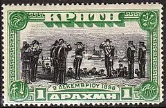 В сентябре 1908 года, после принятия решения об объединении Крита с Грецией, марки прежних выпусков были снабжены надпечаткой «ΕΛΛΑΣ» («Греция»). Выпуск марок с этой надпечаткой продолжался вплоть до 1910 года[1][2].