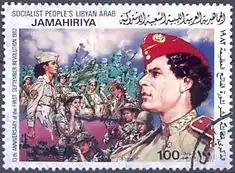 После свержения королевской власти в стране сюжеты ливийских марок претерпели значительные изменения. Начиная с середины 1970-х, почтовое ведомство Ливии эмитировало множество знаков почтовой оплаты (почтовых марок, блоков, малых листов, марочных буклетов, цельных вещей и т. п.), связанных с М. Каддафи. Первым таким выпуском стал блок, посвящённый 6-й годовщине Сентябрьской революции, увидевший свет в 1975 году (Mi #583; Sc #Block 18)[18][19][20].