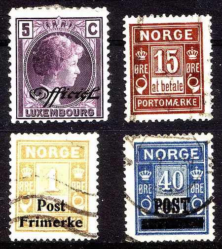 Служебные марки в Люксембурге выпускались с 1875 по 1935 год[4]. На них могут присутствовать надпечатки или проколы аббревиатуры «SP» (от фр. «Service public» — «Публичная служба») или слова «Officiel» («Служебное»)[5].