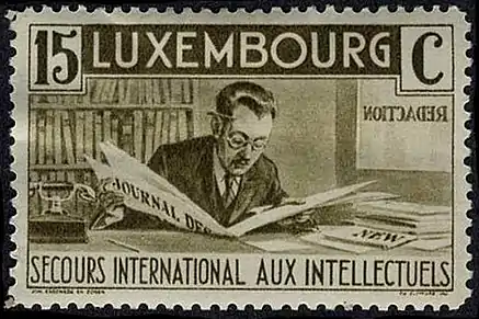 В 1935 году была издана большая почтово-благотворительная серия, которая продавалась по двойной цене с разницей в пользу международного Фонда поддержки интеллигенции. Интересно, что на 15-сантимовой марке имеется сюжетная ошибка рисунка: заголовочная часть с названием изображённой газеты помещена не на первой, а на последней странице[7].