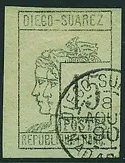 Владение Диего-Суареш[12], с центром в Диего-Суареше, было одной из трёх обособленных французских территорий в этом регионе с 1893 по 1908 год. Для этой колонии были изданы оригинальные почтовые марки с надписью «Diego Suarez» («Диего-Суареш»). Всего было эмитировано 37 почтовых марок и 13 доплатных марок[9].