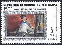 ![]() Марка Демократической Республики Мадагаскар с репродукцией картины Э. Мане (1982) | |
