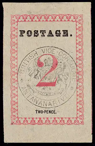 1886: надпись на штампе «British Vice-Consulate Antananarivo» («Британское вице-консульство в Антананариво») (Sc #28)