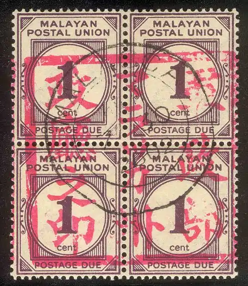 В 1935 году был создан Малайский почтовый союз, в который вошли колония Стрейтс-Сетлментс и Федерированные Малайские Государства. В этот период в почтовом обращении использовались марки колонии и эмиссии отдельных княжеств. В 1936—1938 годах выходили доплатные марки с надписью (англ.) «Малайский почтовый союз», которые были общими и употреблялись в колонии и княжествах Негри-Сембилан, Паханг, Перак и Селангор. Аналогичные доплатные выпуски 1945—1963 годов имели хождение в Сингапуре и Малайской Федерации, а также в Малайской Федерации до 1966 года[1].