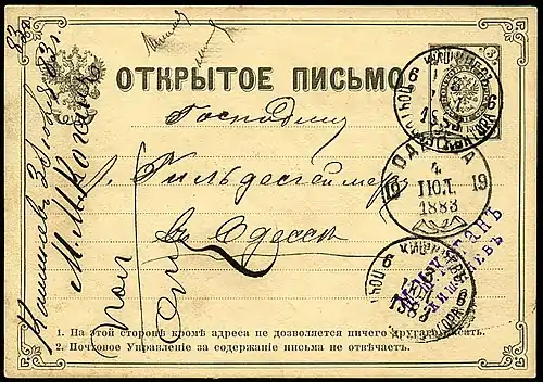 Доставка частной корреспонденции оплачивалась земскими марками с изображением герба Ясского уезда[6].