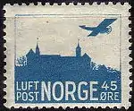 Первая авиапочтовая марка Норвегии вышла в 1927 году. На ней был изображён самолёт над крепостью Акерсхус в Осло. Всего было эмитировано три выпуска норвежских авиапочтовых марок (1927—1934, 1937 и 1941 годов). В дальнейшем для оплаты авиапочтовой корреспонденции использовались обычные марки. Аэрограммы были введены в 1948 году[5][6][9].
