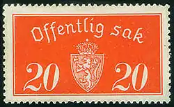 До 1925 года почтовые марки снабжались перфорацией сокращённого названия учреждения и использовались в качестве служебных. Эта практика прекратилась в 1933 году. Служебные марки с изображением государственного герба Норвегии впервые были выпущены в 1926 году и используются до настоящего времени. Название государства на них не указано — только надпись «Offentlig Sak» («Общественное дело»), полностью или сокращённо, и номинал, кроме первого выпуска, на котором была надпись «Tjeneste-frimerke» («Служебная марка»). Служебные марки используются только для внутренней корреспонденции[5][6].
