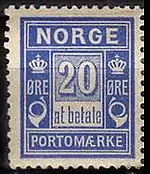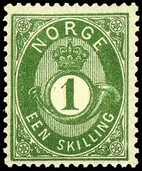 В 1872 году впервые были выпущены марки, на которых запечатлён коронованный почтовый рожок и указан номинал. Этот рисунок используется и на современных марках Норвегии. Столетие этих миниатюр было отмечено в 1972 году выпуском двух знаков почтовой оплаты с изображением юбилейных марок и памятного блока — первого блока Норвегии. 1 января 1877 года марки с изображением почтового рожка вышли с номиналом в новой денежной единице — эре[5][6].