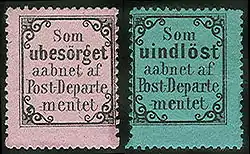 | 1933: служебная марка Норвегии (Sc #O14) | 1872: возвратные марки Норвегии (Mi #I—II) |