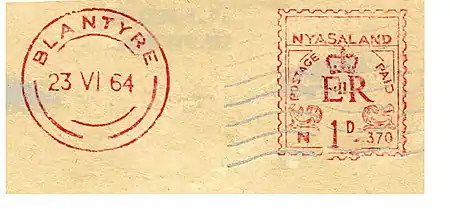 По окончании периода употребления марок Федерации Родезии и Ньясаленда (1954—1963)[2][3], 1 ноября 1963 года были возобновлены самостоятельные выпуски для Ньясаленда, которые были изъяты из обращения 5 июля 1964 года[3].