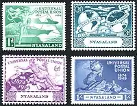 ![]() Серия почтовых марок протектората Ньясаленд, посвящённая 75-летнему юбилею Всемирного почтового союза, 1949 (Mi #89—92; Yt #96—99) | |