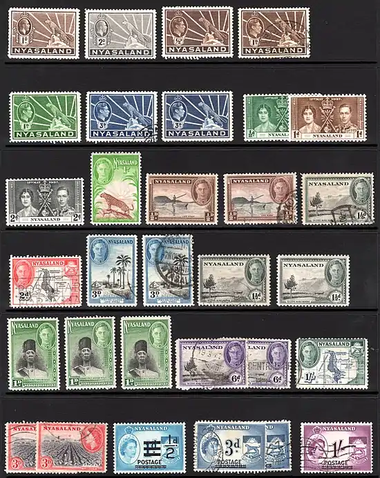 • 1945: Георг VI, герб и карта Ньясаленда, 2 пенса; Георг VI и рыбацкая деревня на озере Ньяса, 3 пенса — два гашёных экземпляра; Георг VI и чайное хозяйство в горах Муланье, 1½ пенса — гашёная и чистая (Mi #73, 74, 72; Yt #80, 81, 79)