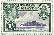 ![]() Марка 1940 года из первой стандартной серии островов Питкэрн (Sc #?) с портретом короля Георга VI и картой Тихого океана | |