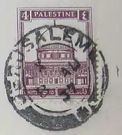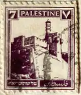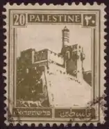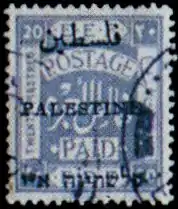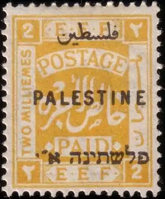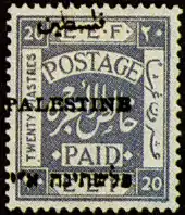 ![]() Первая марка подмандатной Палестины, номиналом в 20 пиастров, с иерусалимской надпечаткой «Палестина» на английском, арабском и иврите, 1920 (SG #26) | |