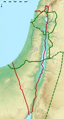 ![]() Исторические границы римской, византийской и исламской Палестины. Древние границы обозначены зелёным, граница 1922 года — красным цветом |