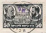 В мае 1948 года у временного правительства Израиля[105], не было наготове собственных почтовых марок, поэтому оно воспользовалось имеющимися виньетками[106] как виньетками Еврейского национального фонда (далее — «ЕНФ»), которые печатались с 1902 года для целей сбора денежных средств[107], так и местными общинными налоговыми марками. На виньетках Еврейского национального фонда была сделана надпечатка на иврите, означающая «почтовый сбор» («doar»)[108], тогда как на местных общинных налоговых марках надпечатки не ставились[109]. Почтовые марки ЕНФ печатались с 3 по 14 мая 1948 года, их реализация была прекращена 14 мая 1948 года. Остатки марок было приказано вернуть и уничтожить[110]. Использование этих почтовых марок допускалось до 22 мая 1948 года[110]. В этот период мандатные почтовые тарифы оставались без изменений[111].