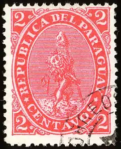 1 августа 1870 года Республика Парагвай выпустила свои первые почтовые марки (номиналом в 1, 2 и 3 реала)[1][2][3][8], изготовленные литографским способом Р. Ланге (R. Lange) в Буэнос-Айресе[9]. На марках был изображён герб Парагвая[6] — стоящий на задних лапах лев, поднимающий республиканскую шляпу[9][≡]. Оценка серии по каталогу «Ивер» составляет около 330 евро.[10]