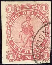 ![]() Первая почтовая марка Парагвая номиналом в 1 реал, розового цвета, литография, погашена в Асунсьоне, 1870 (Mi #1; SG #1)[^] | |