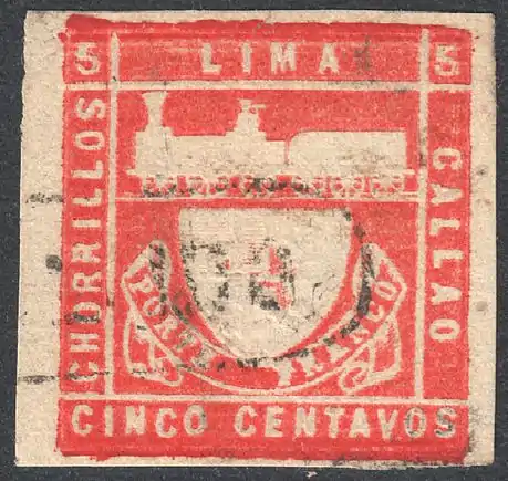 В 1871 году с целью оплаты транспортировки почтовых отправлений по железной дороге Лима — Кальяо почтовым ведомством этой страны была выпущена специальная (железнодорожная) почтовая марка, которую считают первой в мире памятной маркой[2][21]. Она была издана по случаю 20-летия открытия железной дороги между Лимой и Кальяо[21][22]. Эта же марка считается второй в мире почтовой миниатюрой с изображением паровоза[23][≡].
