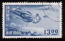 В феврале 1950 года были эмитированы первые три авиапочтовые марки Рюкю[2][3]. Марки вышли двумя тиражами[2]. Надписи на них: «Air mail» («Авиапочта»)[4]. В 1952—1954 годах в обращении появились ещё пять номиналов авиапочтовых марок[2].