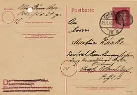 После капитуляции Германии на территории оккупированной Саксонии с помощью советской военной администрации уже в первые дни мая 1945 года была восстановлена деятельность почты. В связи с отсутствием знаков почтовой оплаты в образованной федеральной земле Саксония[21] было разрешено использовать марки прежних выпусков, на которых изображения портретов и нацистской символики были предварительно замазаны чёрной штемпельной краской. Соответствующие распоряжения вышли в Главной почтовой дирекции (ГПД) Хемница 12 мая 1945 года и в ГПД Дрездена 23 мая 1945 года. Подобная обработка знаков почтовой оплаты известна как «саксонское зачернение». Письма, отправленные до 9 мая 1945 года, проходили такую обработку перед доставкой. Так как все зачернения производились почтовыми отделениями самостоятельно, формы и способы были различные. Использовались пробковые и резиновые штемпеля, мазки, отпечатки пальцев и т. д. Аналогичным образом использовались и цельные вещи[3][22][23][24][25][26].